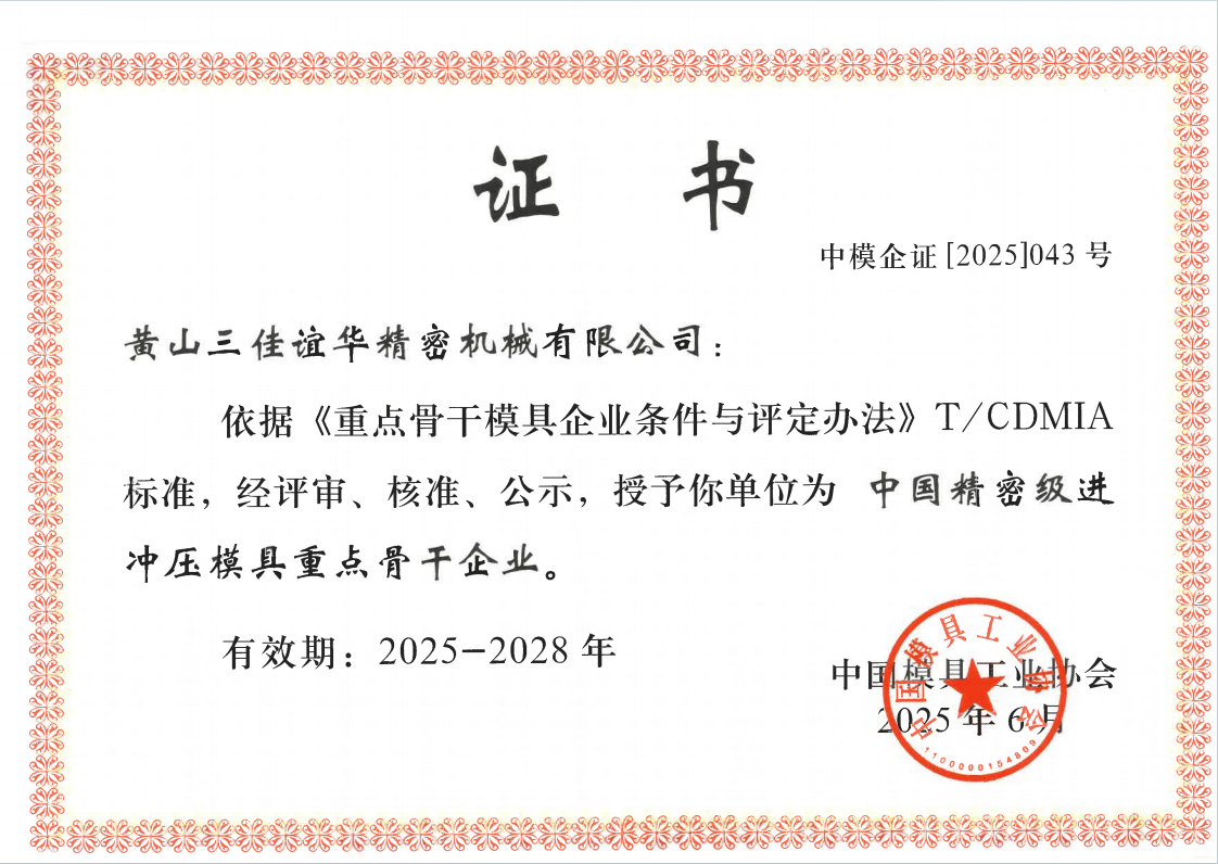 “中国精密级进冲压模具重点骨干企业”的评定依据《重点骨干模具企业条件与评定办法》T/CDMIA标准进行。该评定体系严格,涵盖了企业的技术研发能力、生产制造水平、产品质量、市场占有率、经营管理、行业贡献等多个维度的综合实力。经过严格的评审、核准和公示程序,黄山三佳谊华凭借其扎实的功底、突出的表现和显著的行业影响力,成功获此殊荣。
